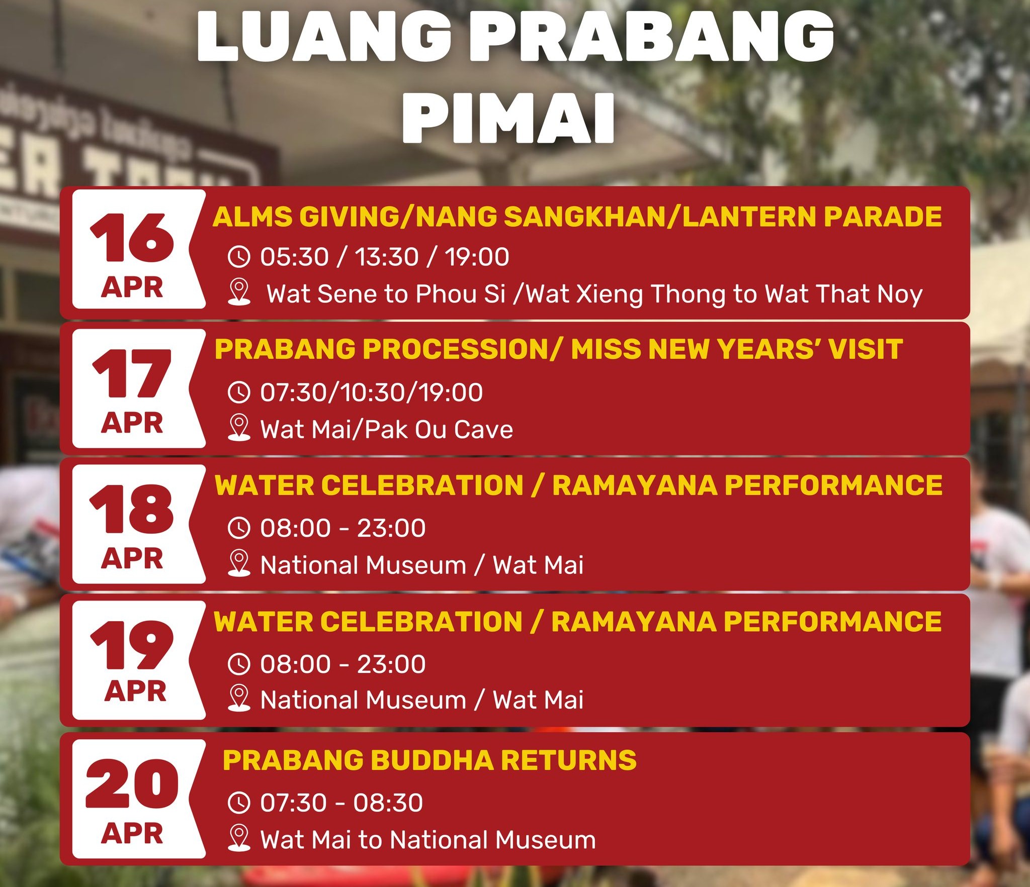 For 2026, Luang Prabang will host a special 10-day Pi Mai Lao celebration from 11 to 20 April 2026. The program is being organized across the UNESCO-listed district with traditional activities, safety coordination and festival events throughout the city. The main highlights include the Nang Sangkhane pageant, the Hae Vor cultural procession, and the ceremonial bathing of the sacred Phra Bang Buddha image at the Luang Prabang National Museum.