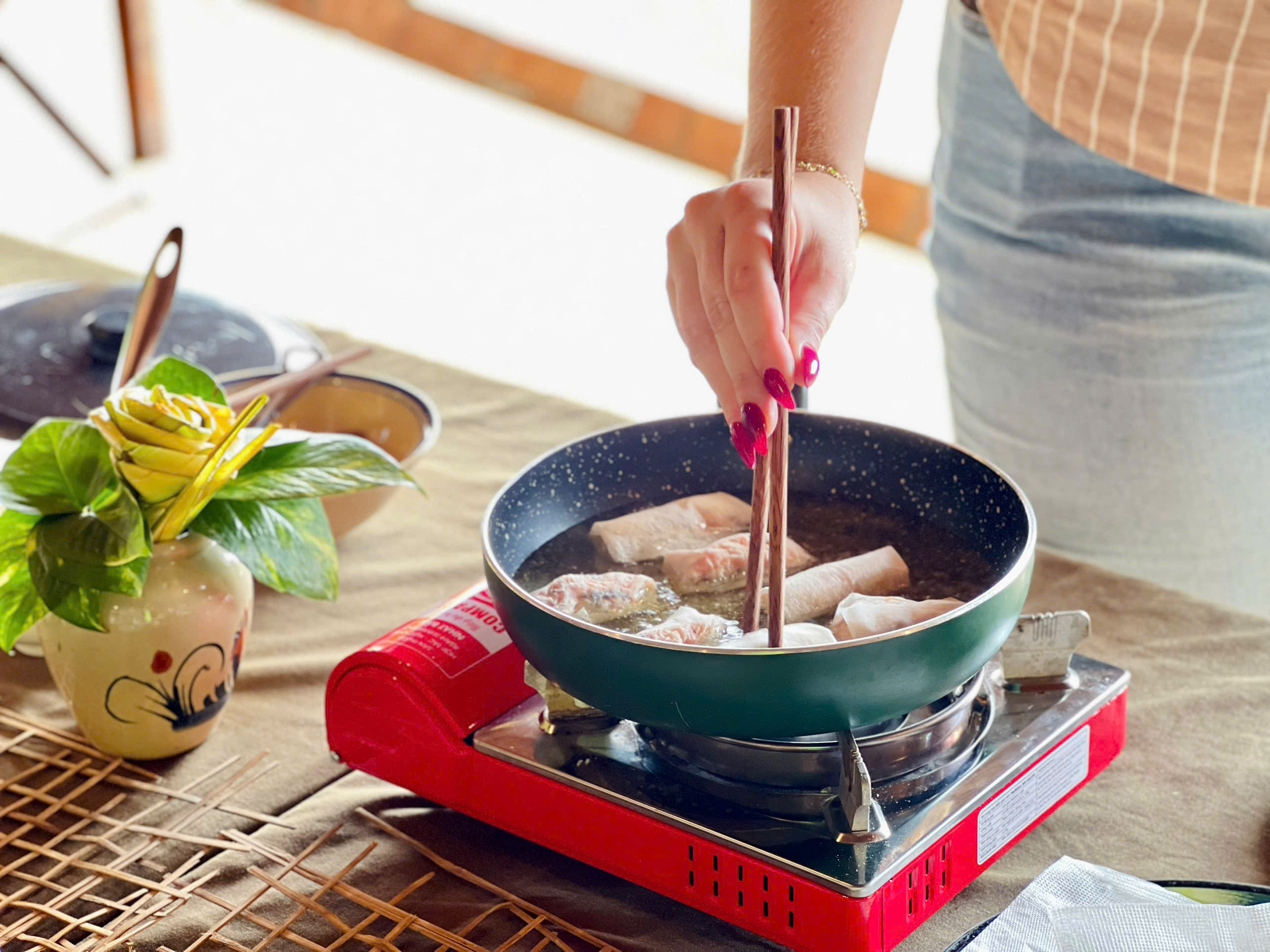 Cha gio, known to many as Vietnamese fried spring rolls, is another highlight of the class. In Ben Tre, the filling often uses local vegetables, minced pork, mushrooms and sometimes taro for extra texture. Everything is mixed gently so the flavors stay balanced.
