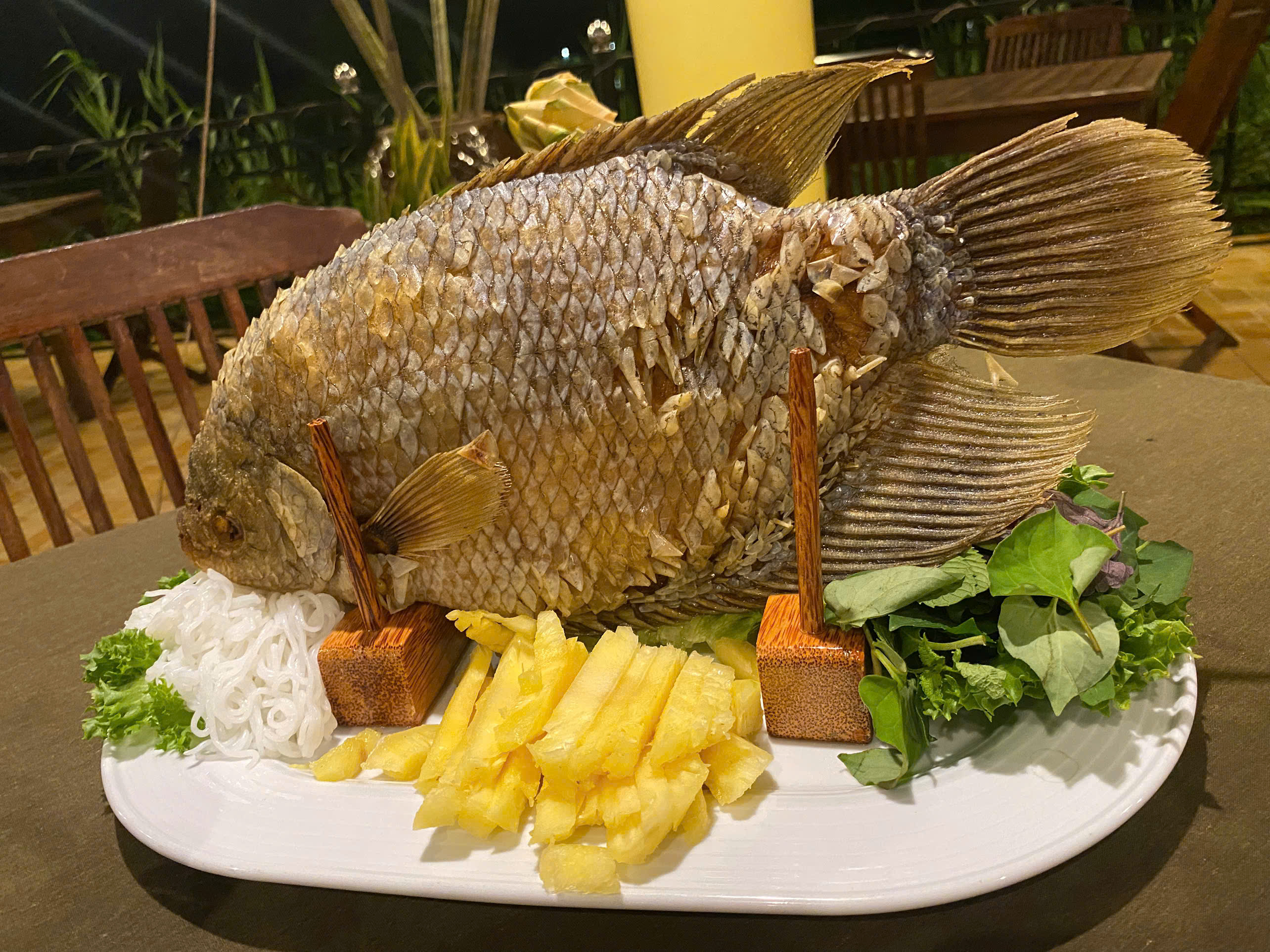 Before frying, the fish is cleaned carefully and seasoned with a touch of salt and pepper. The key to the traditional method is frying the entire fish upright, using a special rack that allows hot oil to pour evenly from top to bottom. The oil transforms the skin into a golden, crispy layer while keeping the meat inside soft and naturally sweet. Local hosts explain that this technique comes from generations of riverside cooking, where simplicity and skill blend to create a dish full of character.
