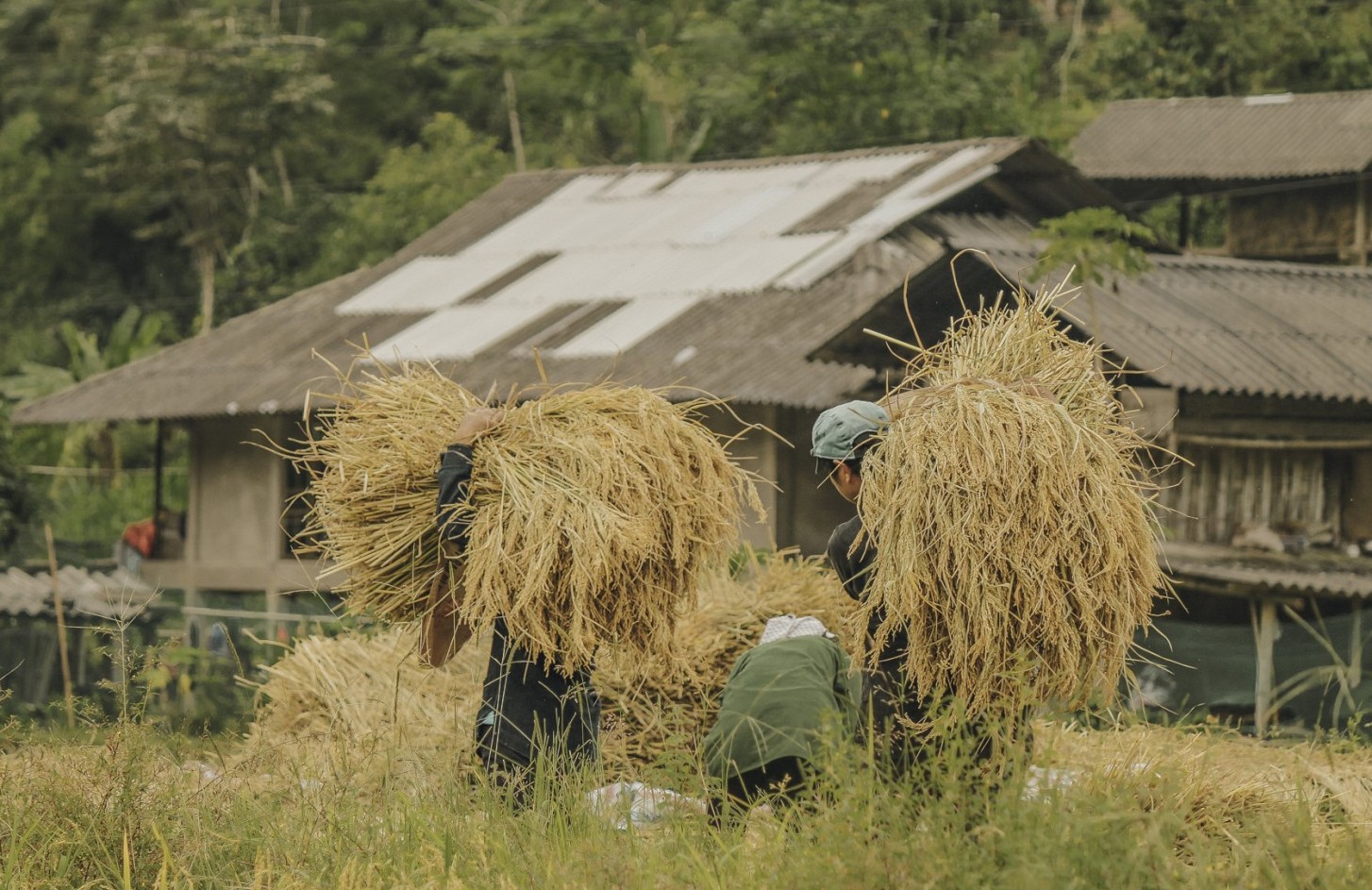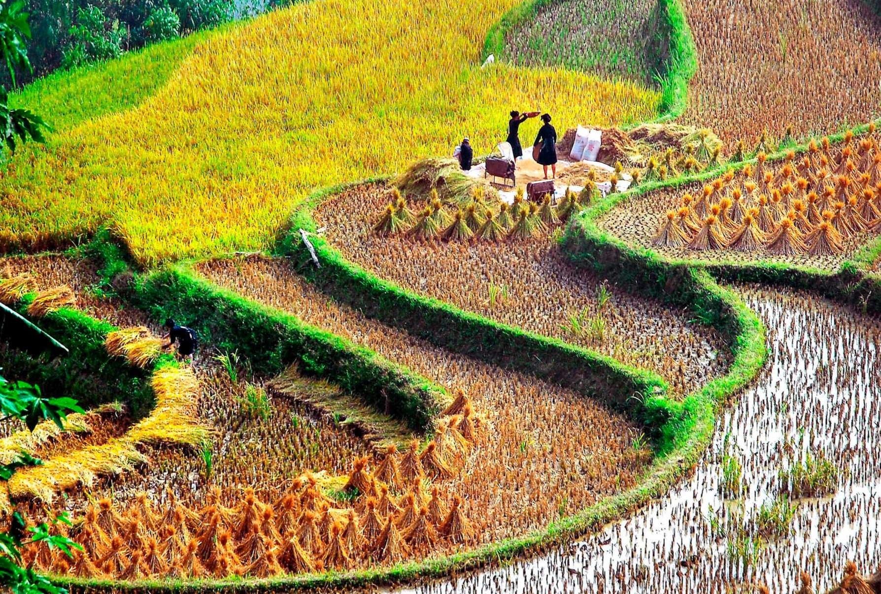 The golden terraces are not just a postcard view; they are the lifeblood of the Tay, Dao, H’mong, and Nung people who have shaped these mountains for generations. During harvest, entire families come together — children, parents, and grandparents all play a role. Songs echo across the valleys, laughter mixes with the sound of sickles, and terraces turn into a living stage of culture and labor.