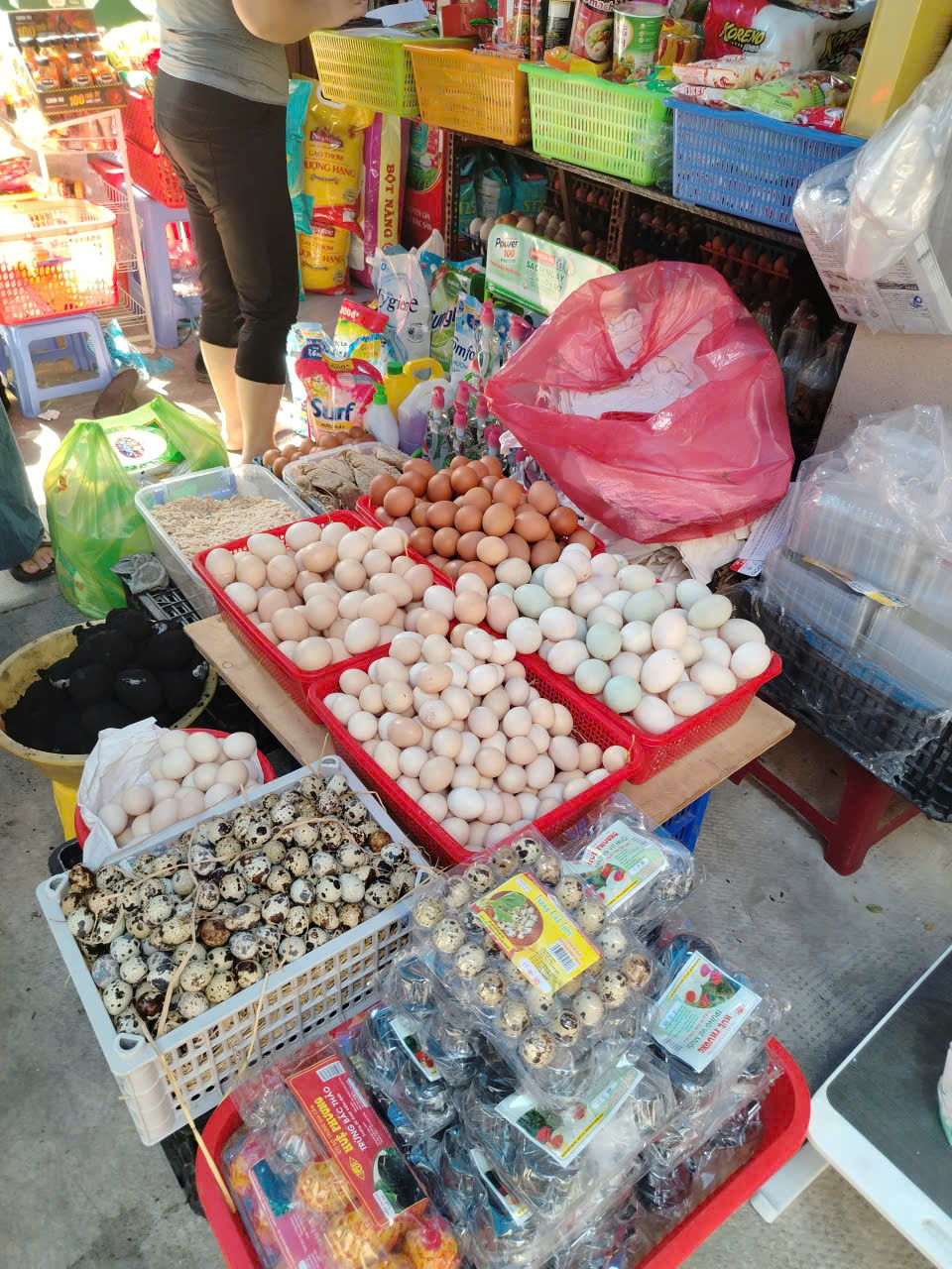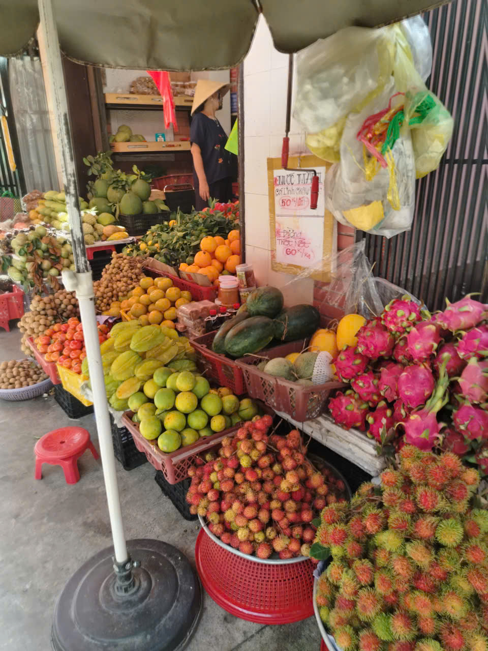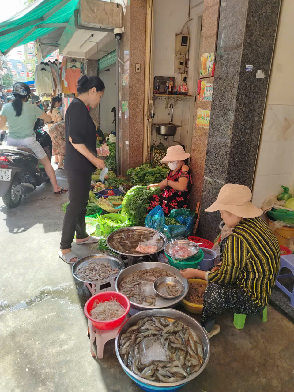 Morning light filters through awnings as locals haggle over pomelos, dragon fruits, and longans. Women in patterned áo bà ba sort herbs and leafy greens, while fishmongers display trays of fresh seafood on metal pans. The air is alive — filled with chatter, motorbike engines, and the aroma of street food that tempts every passerby.